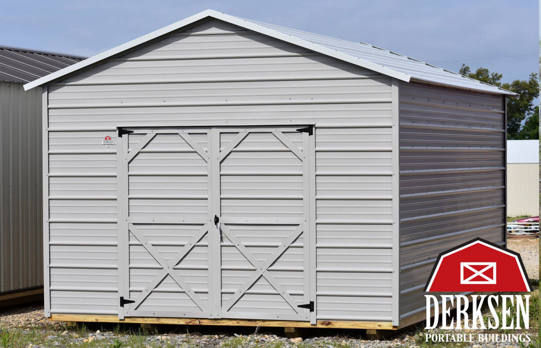 Great storage space at a great price, sturdy portable building with 2 x 4 studs, 29 gauge metal siding and roof, 2 x 4 floor joists set into notched skids, 5/8 inch flooring.